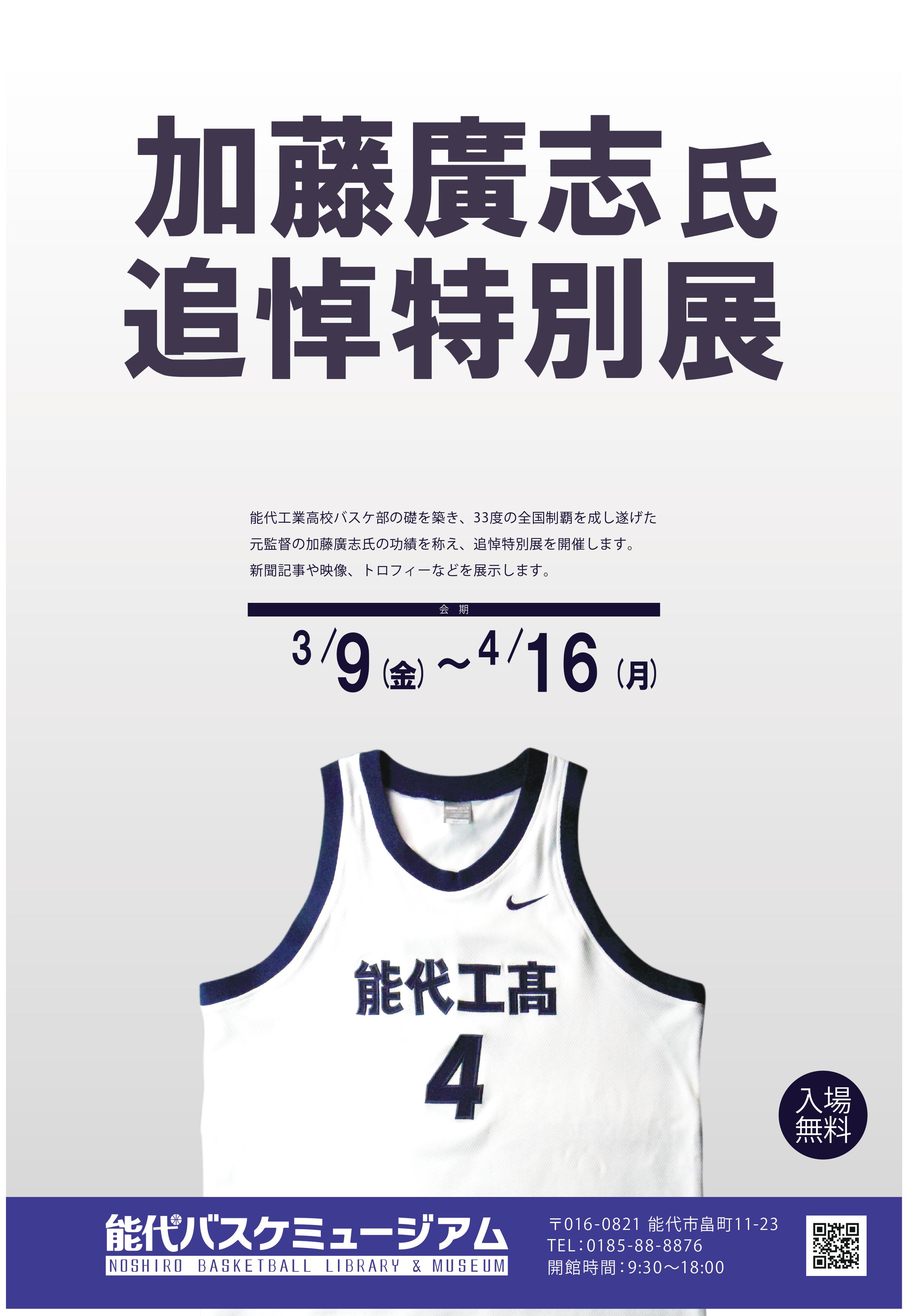 2018/03/08 / 最終更新日時 : 2018/03/08 hoophall お知らせ 「加藤廣志氏 追悼特別展」開催のお知らせ(3/9~4/16) 能代バスケミュージアムでは、元秋田県立能代工業高等学校バスケットボール部監督で、2018年3月4日に亡くなられた加藤廣志氏の功績を振り返る「加藤廣志氏 追悼特別展」を開催します。 期 間:3月9日(金)~4月16日(月) 時 間:午前9時30分から午後6時まで 内 容:新聞記事や映像、トロフィーなどを展示 入 場:無 料 Follow me! FacebookXHatenaPocketCopy