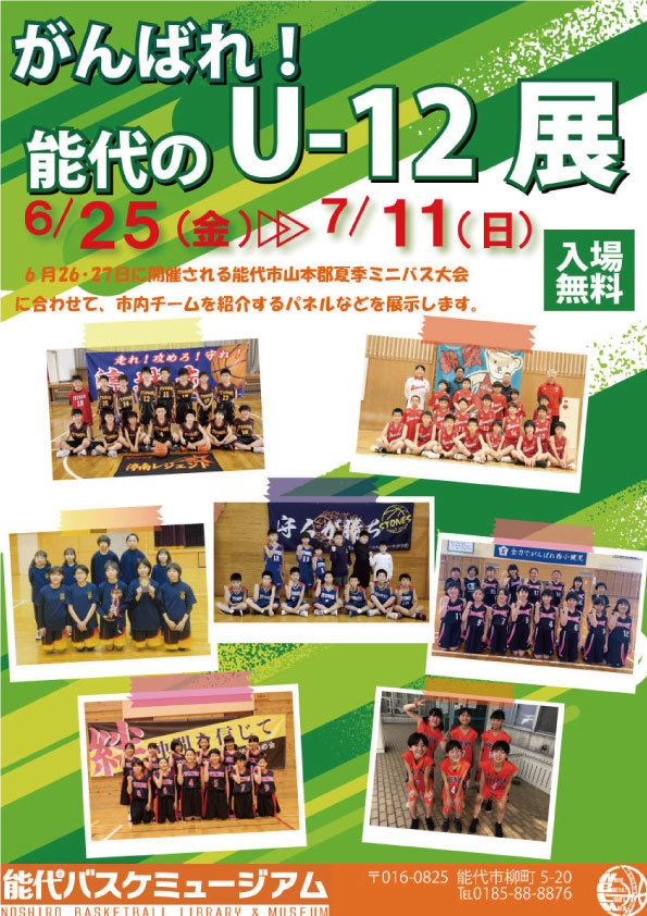 2021/06/24 / 最終更新日時 : 2021/06/24 hoophall お知らせ がんばれ!能代のU-12展開催(6/25~7/11)のお知らせ 能代市山本郡夏季ミニバス大会(6月26日・27日)にあわせて、能代バスケミュージアムで6月25日(金)から7月11日(日)まで、「がんばれ!能代のU-12展」を開催します。 男女7チームの紹介パネルや、過去のミニバスの試合映像などを放映して、ミニバスを頑張る子どもたちを応援します!ぜひお気軽にお越しください。 Follow me! FacebookXHatenaPocketCopy