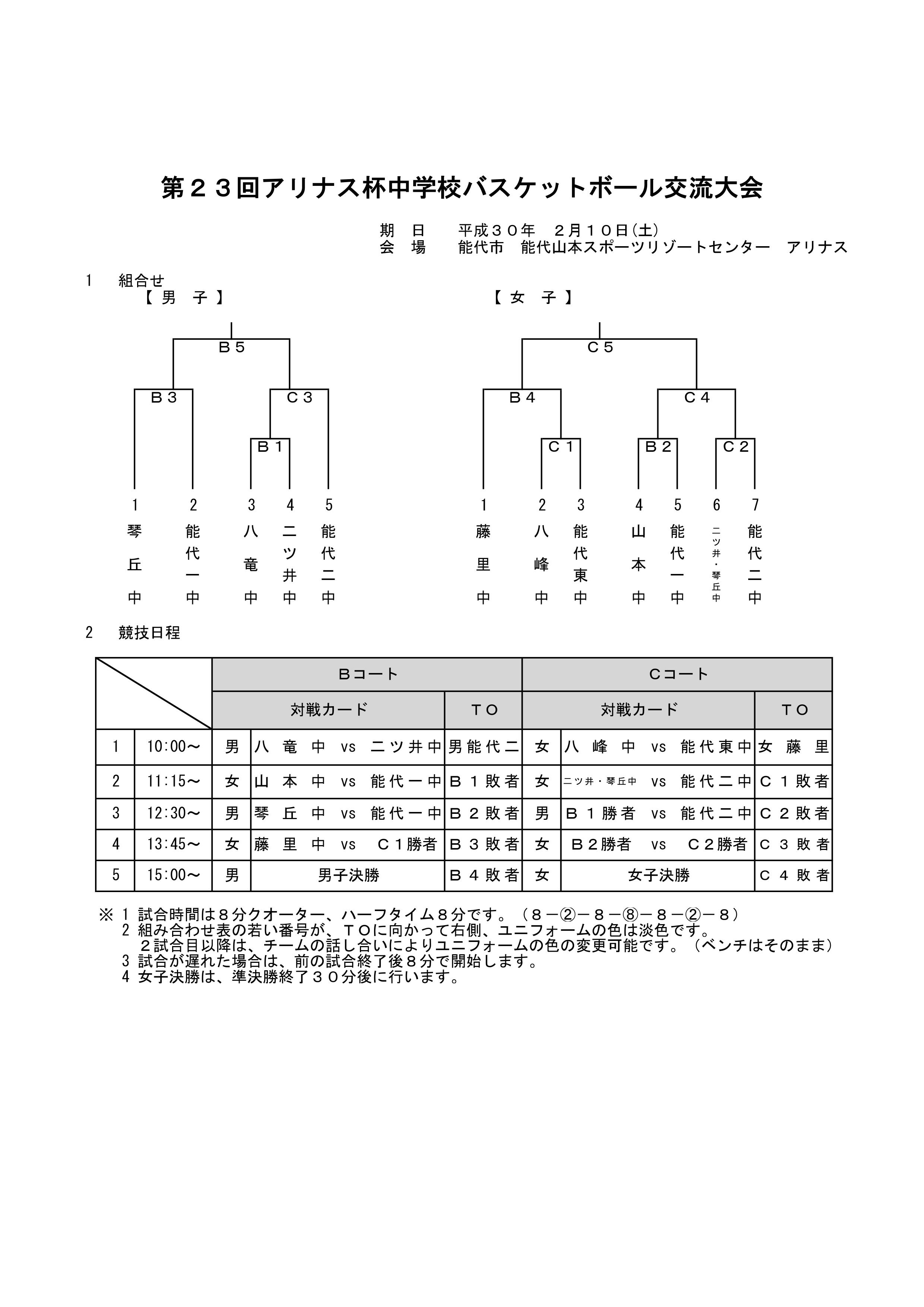 2018年2月10日(土)~11日(日)にアリナスで開催予定だった第23回アリナス杯中学校バスケットボール交流大会について、インフルエンザによる参加辞退の申出があったことから、2月10日(土)のみの開催となり、併せて組合せも変更になっていますのでお知らせします。