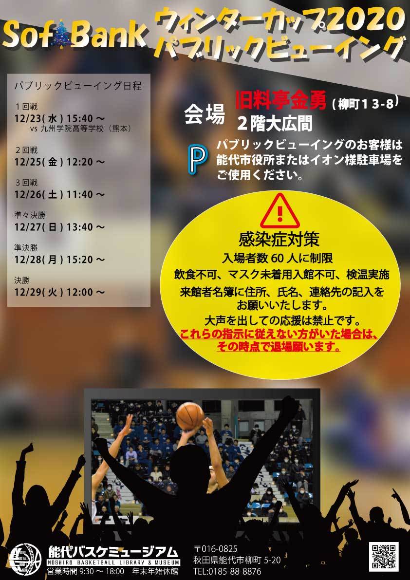 2020年12月23日から始まる「SoftBankウィンターカップ2020」の能代工高の試合のパブリックビューイングを開催します。