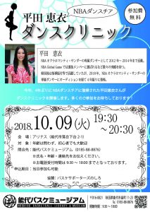 2018/10/04 / 最終更新日時 : 2018/10/04 hoophall お知らせ 平田恵衣ダンスクリニックのお知らせ(10/9) 2018年10月9日(火)にアリナスで、NBAオクラホマシティ・サンダーの専属ダンサーの平田恵衣さんのダンスクリニックが急遽開催されます。 NBAのシーズン前の一時帰国中の平田恵衣さんのダンスクリニックは貴重なチャンスです! Follow me! FacebookXHatenaPocketCopy