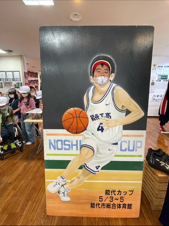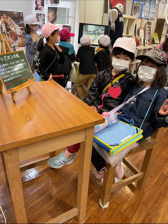 能代工業時代に教室で使っていたビッグマン用の特大机と椅子に座ってみたり、秋田ノーザンハピネッツの外国籍選手の34センチのバッシュを履いてみたりして、バスケ選手の大きさにびっくりした様子。