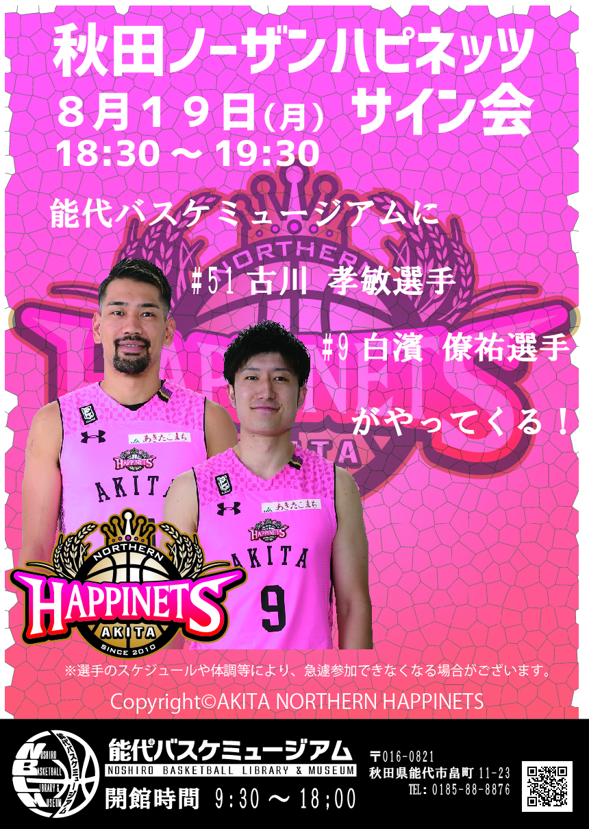 本日告知した8月19日(月)18時30分より能代バスケミュージアムで予定されている、秋田ノーザンハピネッツのサイン会について、参加選手が変更となることをお知らせいたします。