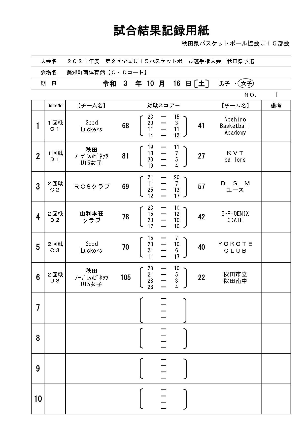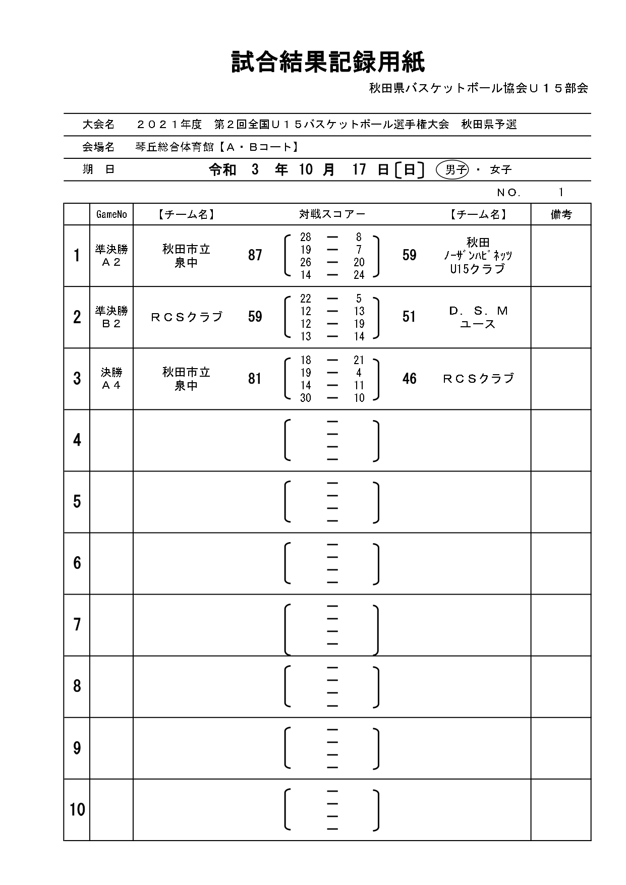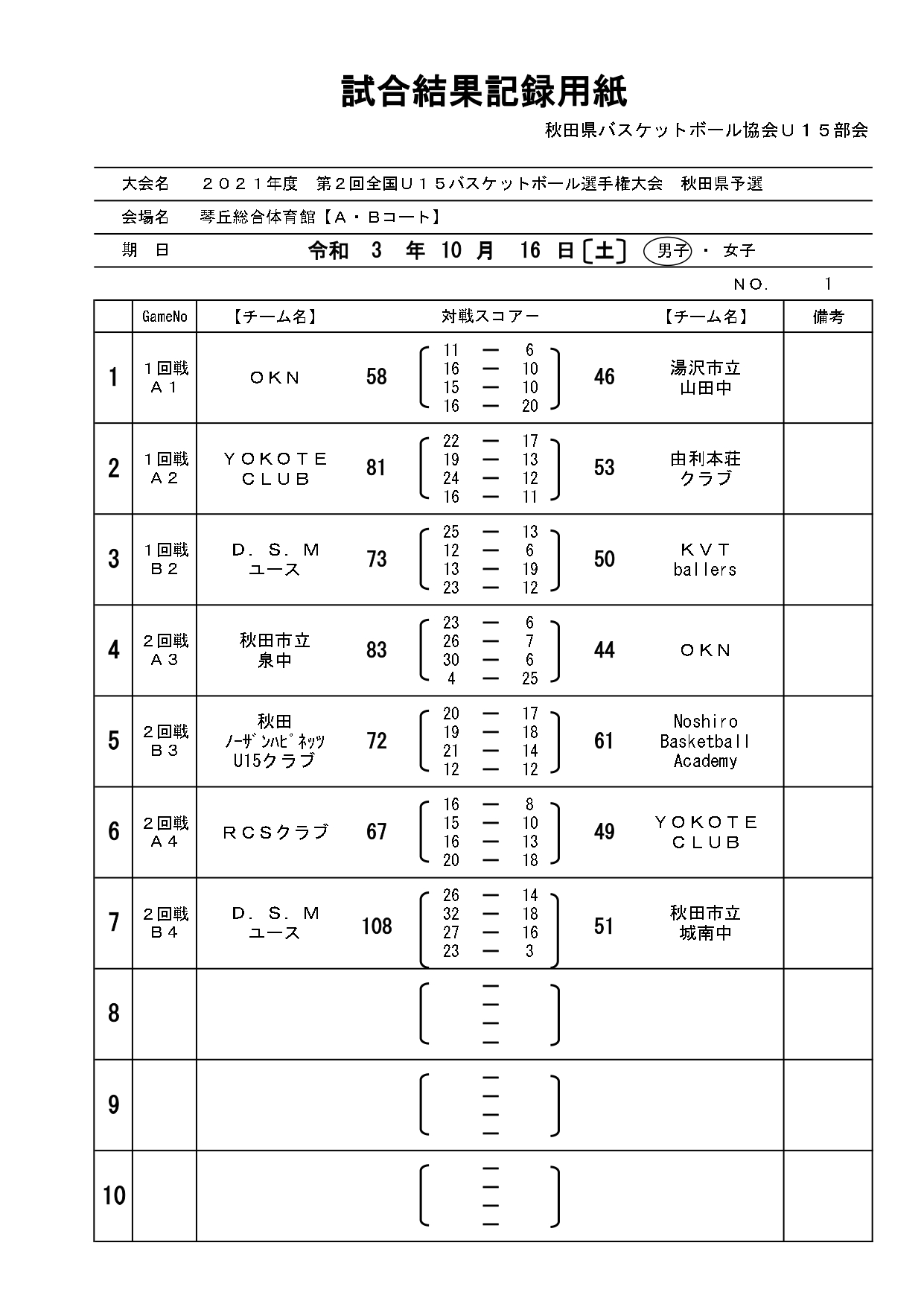 第2回全国U15バスケットボール選手権大会秋田県予選結果(10/21)