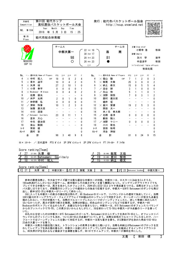 第31回能代カップ速報 中部大一vs洛南(2018/5/3)第5試合