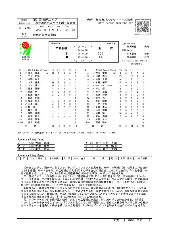 第31回能代カップ速報 市船vs明成 (2018/5/3)第3試合