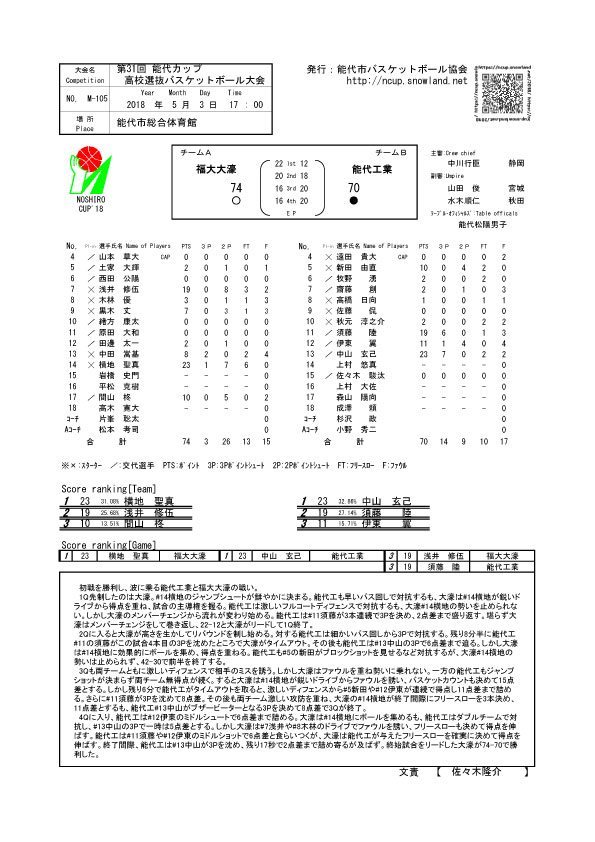 第31回能代カップ速報 福大大濠vs能工(2018/5/3)第6試合