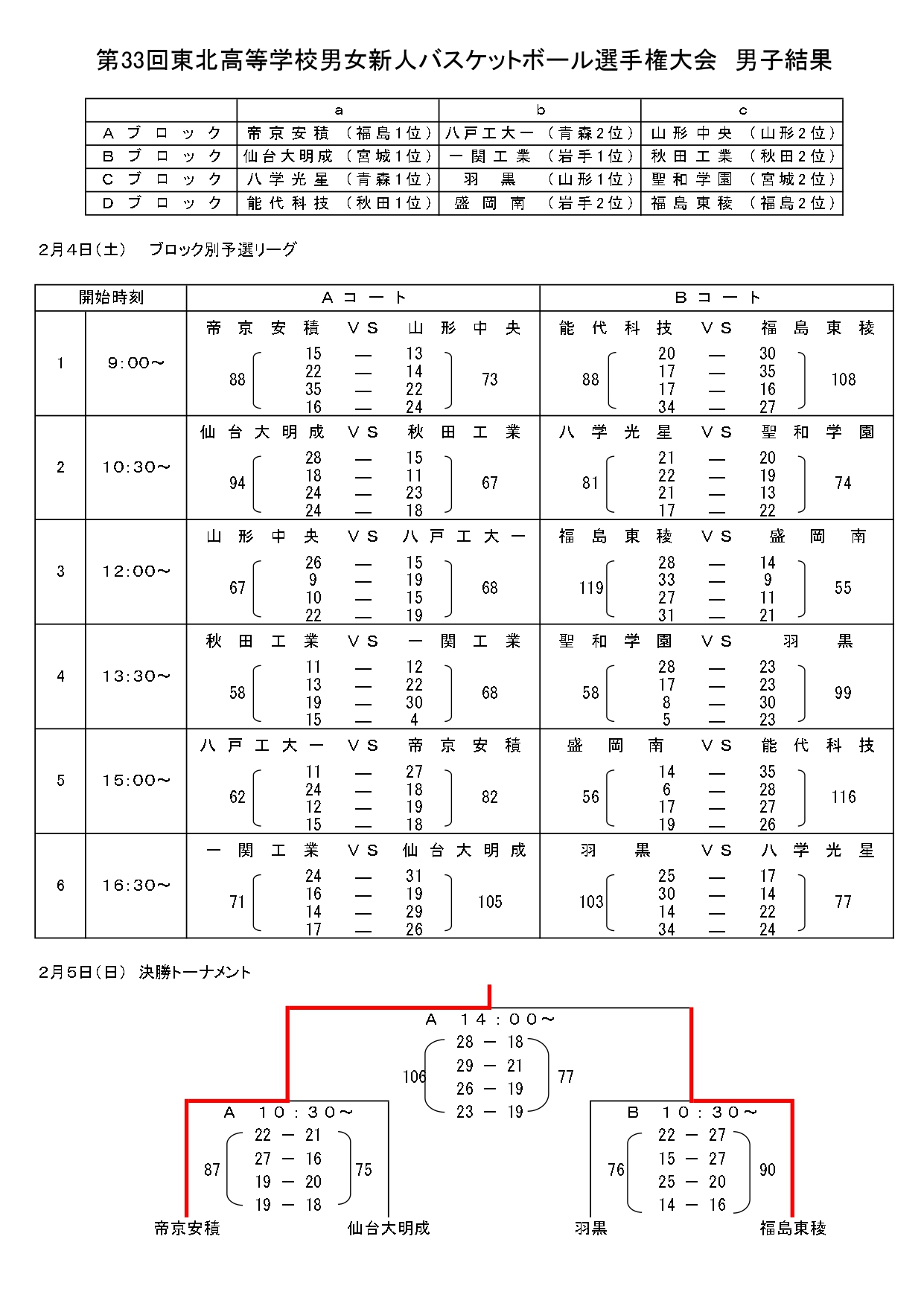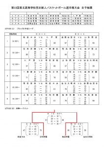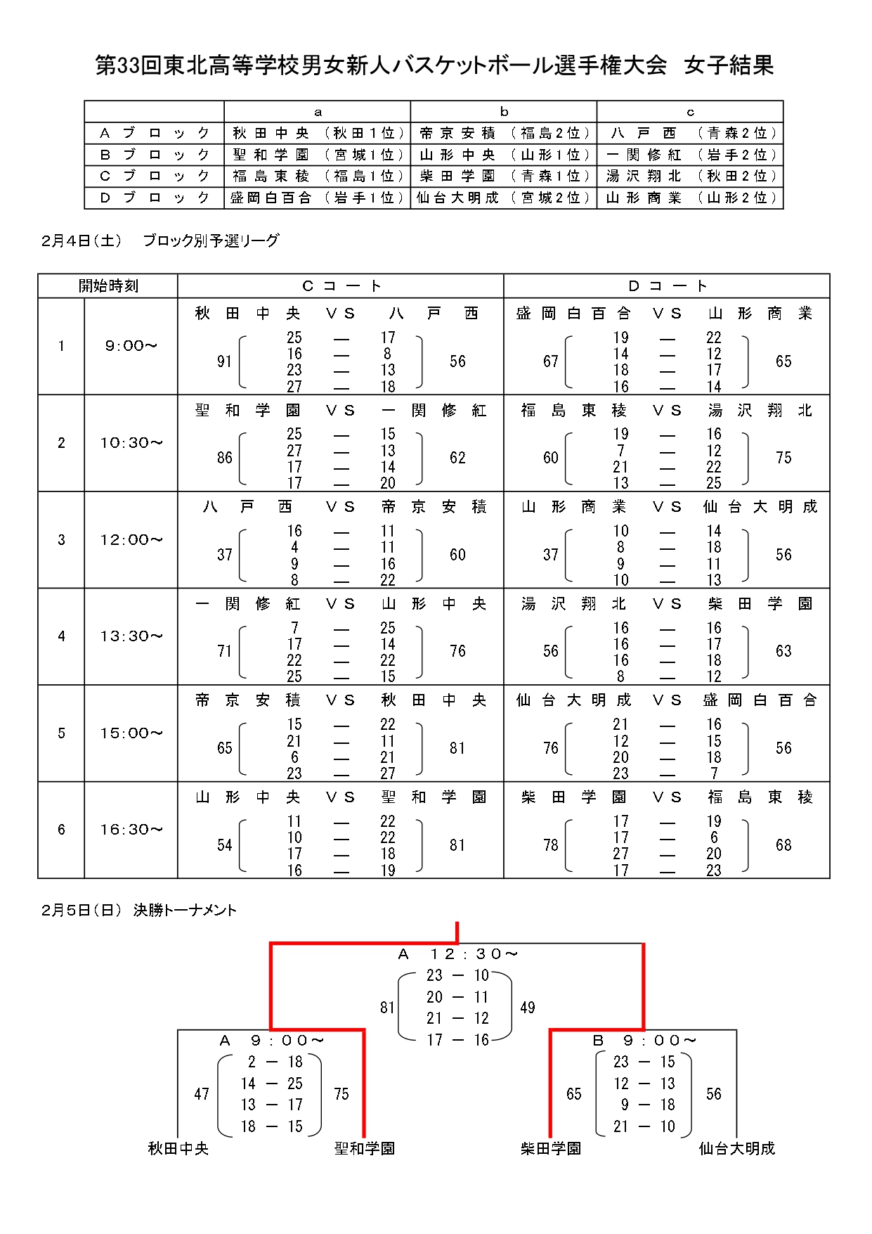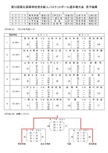 2023/02/06 / 最終更新日時 : 2023/02/06 hoophall お知らせ 第33回東北高校男女新人バスケットボール選手権大会結果(2/6) 第33回東北高校男女新人バスケットボール選手権大会が2/4~5日、福島市のあづま総合体育館で開催され、男子は帝京安積(福島県)、女子は聖和学園(宮城県)が優勝しました。 秋田県男子代表の能代科学技術は予選リーグ1勝1敗、秋田工業は2敗で、いずれも決勝トーナメント進出はなりませんでした。また、女子の湯沢翔北は1勝1敗で予選リーグ敗退、秋田中央は2勝で決勝トーナメントに進みましたが、聖和学園に敗れ、3位となりました。 結果は以下のとおりです。 【男子】 【女子】 Follow me! FacebookXHatenaPocketCopy