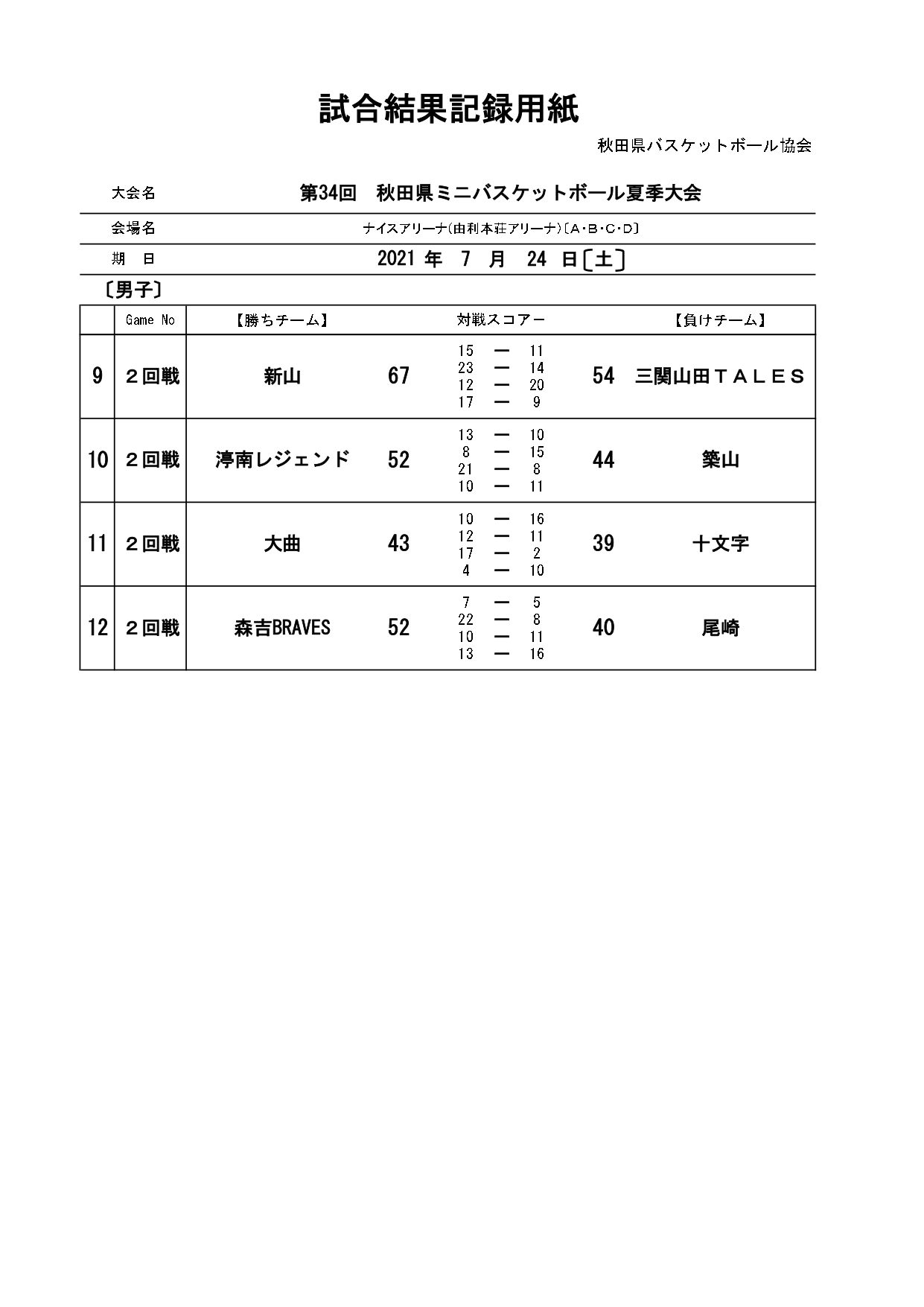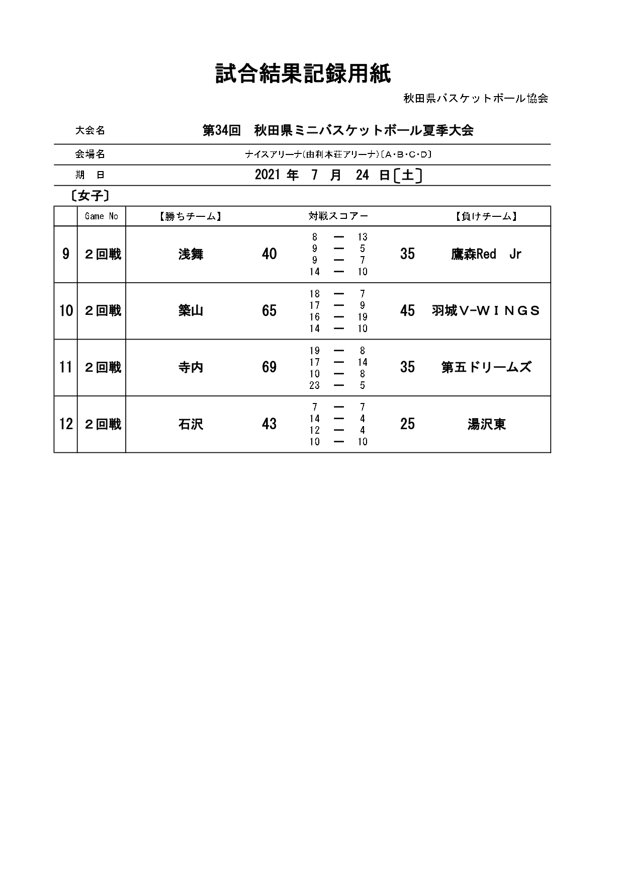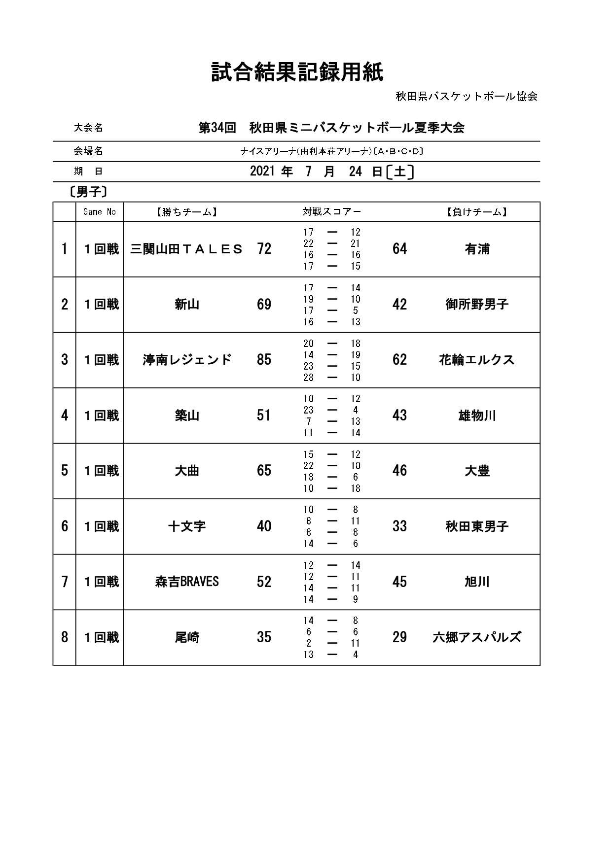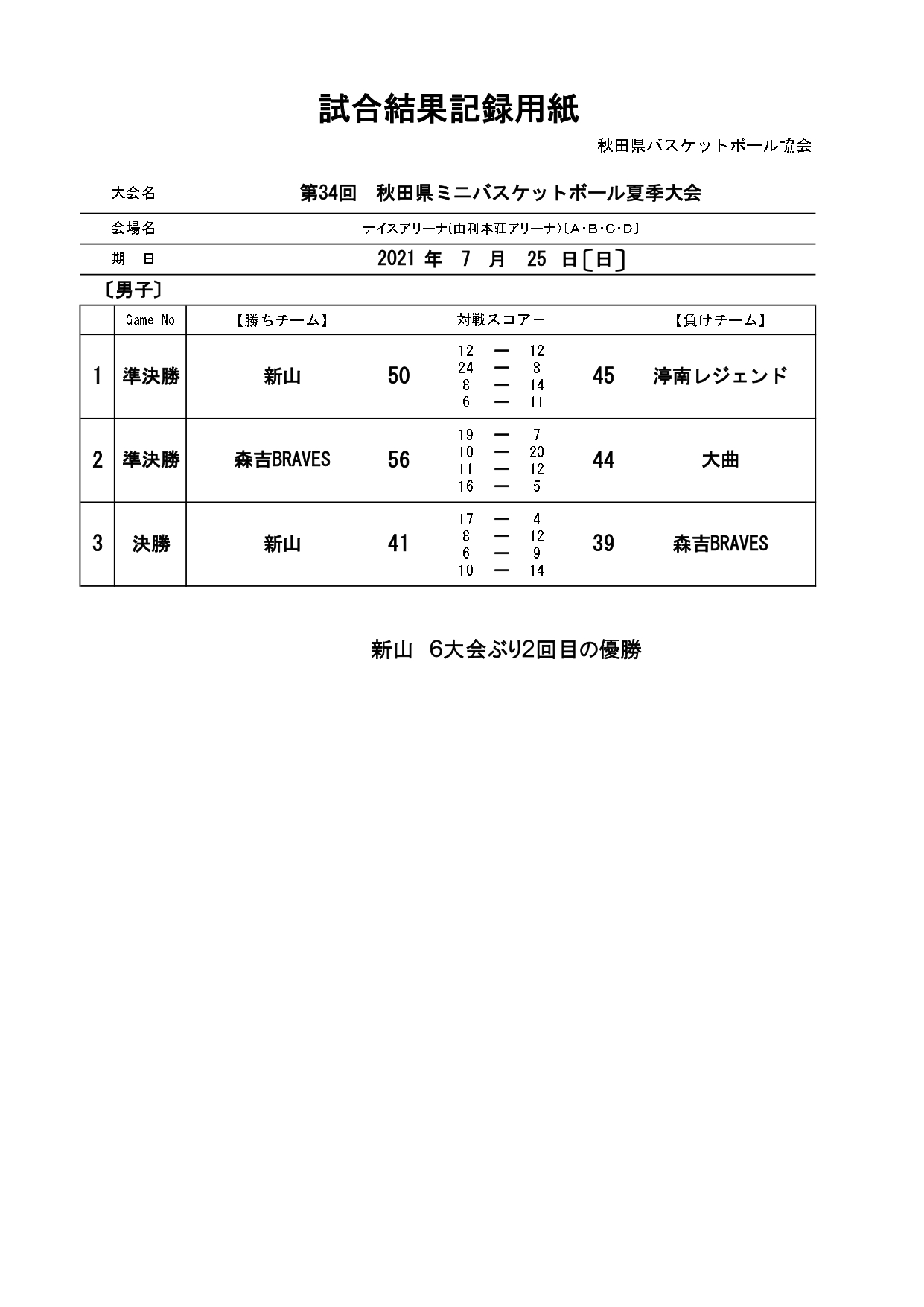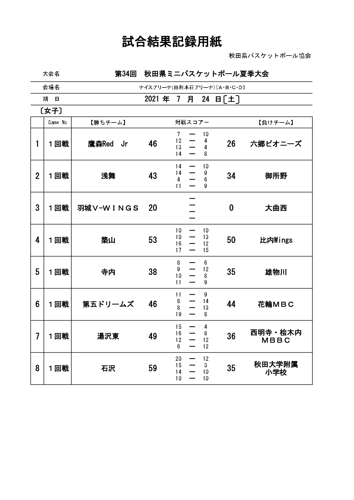 第34回秋田県ミニバスケットボール夏季大会結果(7/25)