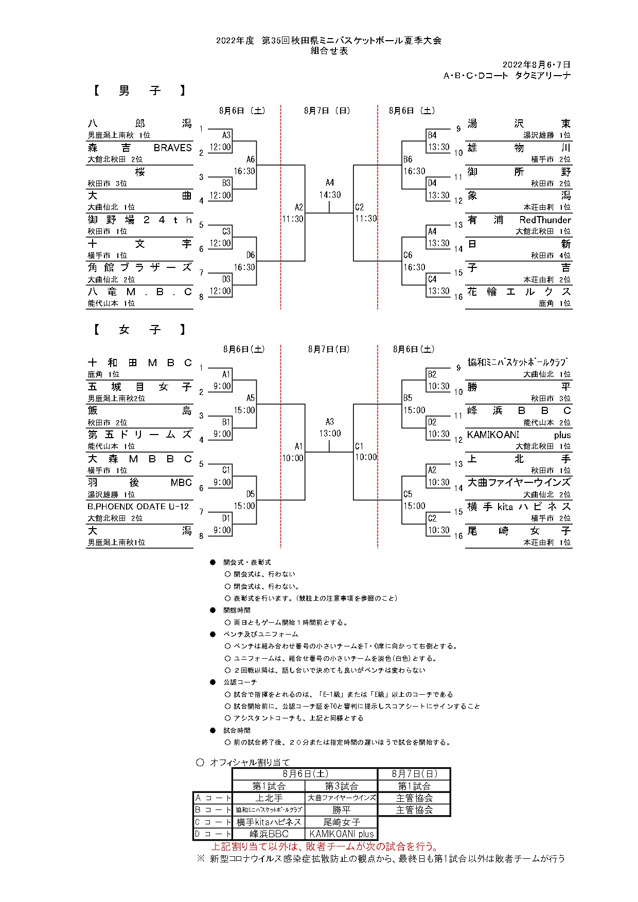 2022/08/04 / 最終更新日時 : 2022/08/04 hoophall お知らせ 第35回秋田県ミニバスケットボール大会夏季大会組み合わせ(8/4) 2022年度第35回秋田県ミニバスケットボール夏季大会が8/6・7日の2日間、大館市のタクミアリーナで開催されます。 能代山本代表として、男子は八竜M.B.C、女子は第五ドリームズが出場します。両チームの皆さん、頑張ってください! なお、新型コロナウイルス感染拡大防止のため、一般観客の入場はできませんので、ご了承ください。 男女のトーナメントは以下のとおりです。 Follow me! FacebookXHatenaPocketCopy