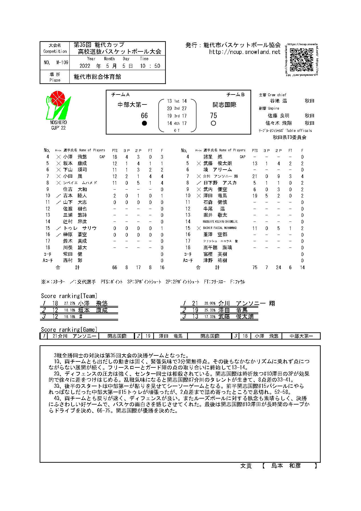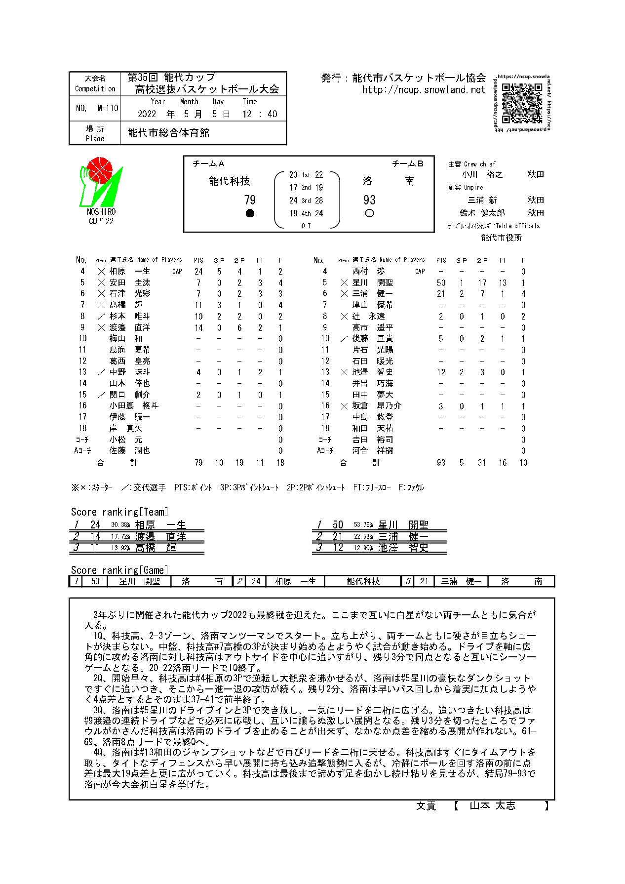 能代カップ最終日(5/5)の結果は、以下のとおりです。