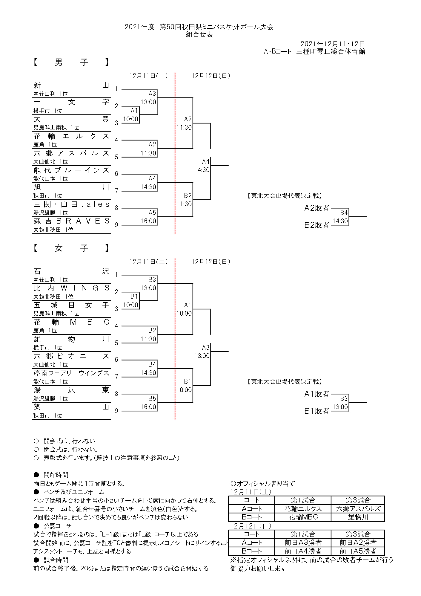 2021/12/09 / 最終更新日時 : 2021/12/09 hoophall お知らせ 第50回秋田県ミニバスケットボール大会開催のお知らせ(12/9) さきがけ2021 2021年度第50回秋田県ミニバスケットボール大会が12月11日(土)・12日(日)、三種町琴丘体育館で開催されます。能代山本地区からは、男子能代ブルーインズ、女子渟南フェアリーウイングスが出場します。 なお、新型コロナウイルス感染症対策のため、無観客試合となります。 組み合わせは以下のとおりです。 Follow me! FacebookXHatenaPocketCopy