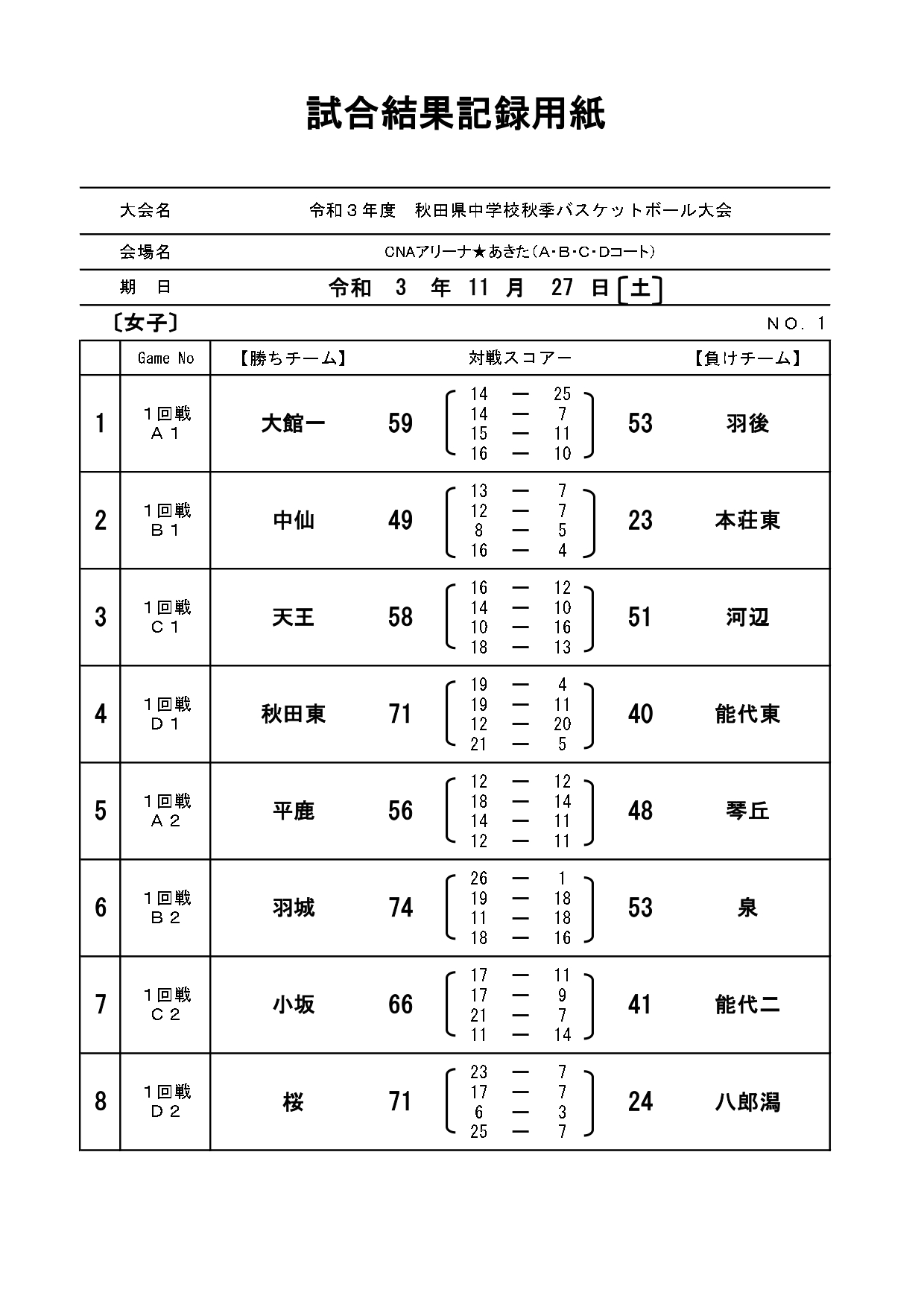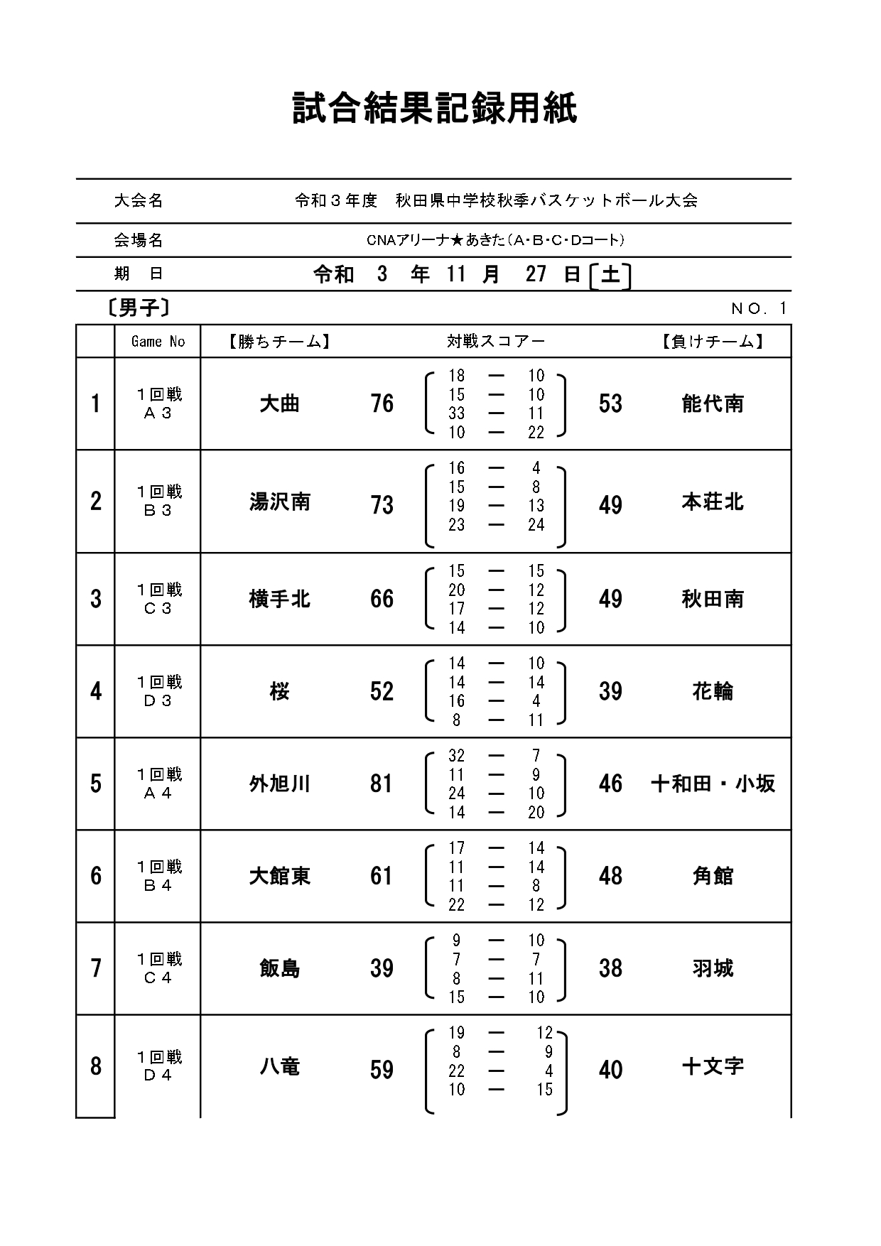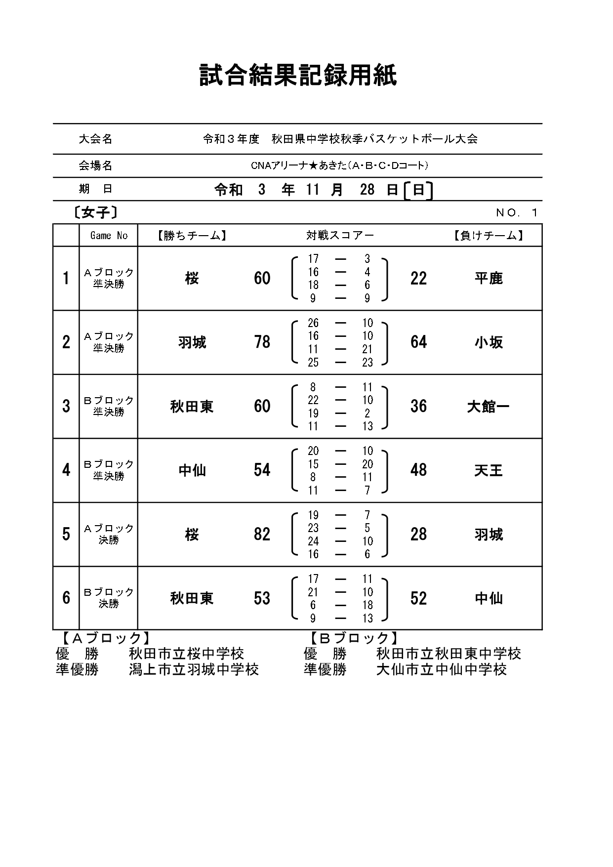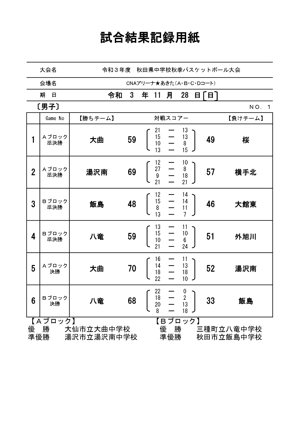 2021/11/29 / 最終更新日時 : 2021/11/29 hoophall お知らせ 第52回秋田県中学校秋季バスケットボール大会結果(11/29) 第52回秋田県中学校秋季バスケットボール大会が11月27・28日、秋田市のCNAアリーナで開催され、男女ともにA・Bブロックに分かれて熱戦を展開しました。 試合の結果、男子は能代山本地区代表の八竜がブロック優勝しました。男子の能代南、女子の能代東、琴丘、能代二はいずれも健闘したものの、初戦敗退となりました。 試合結果は以下のとおりです。 【男子・11/27】 【男子・11/28】 【女子・11/27】 【女子・11/28】 Follow me! FacebookXHatenaPocketCopy