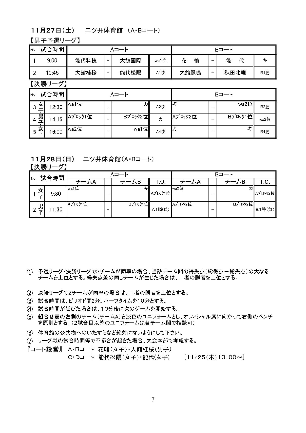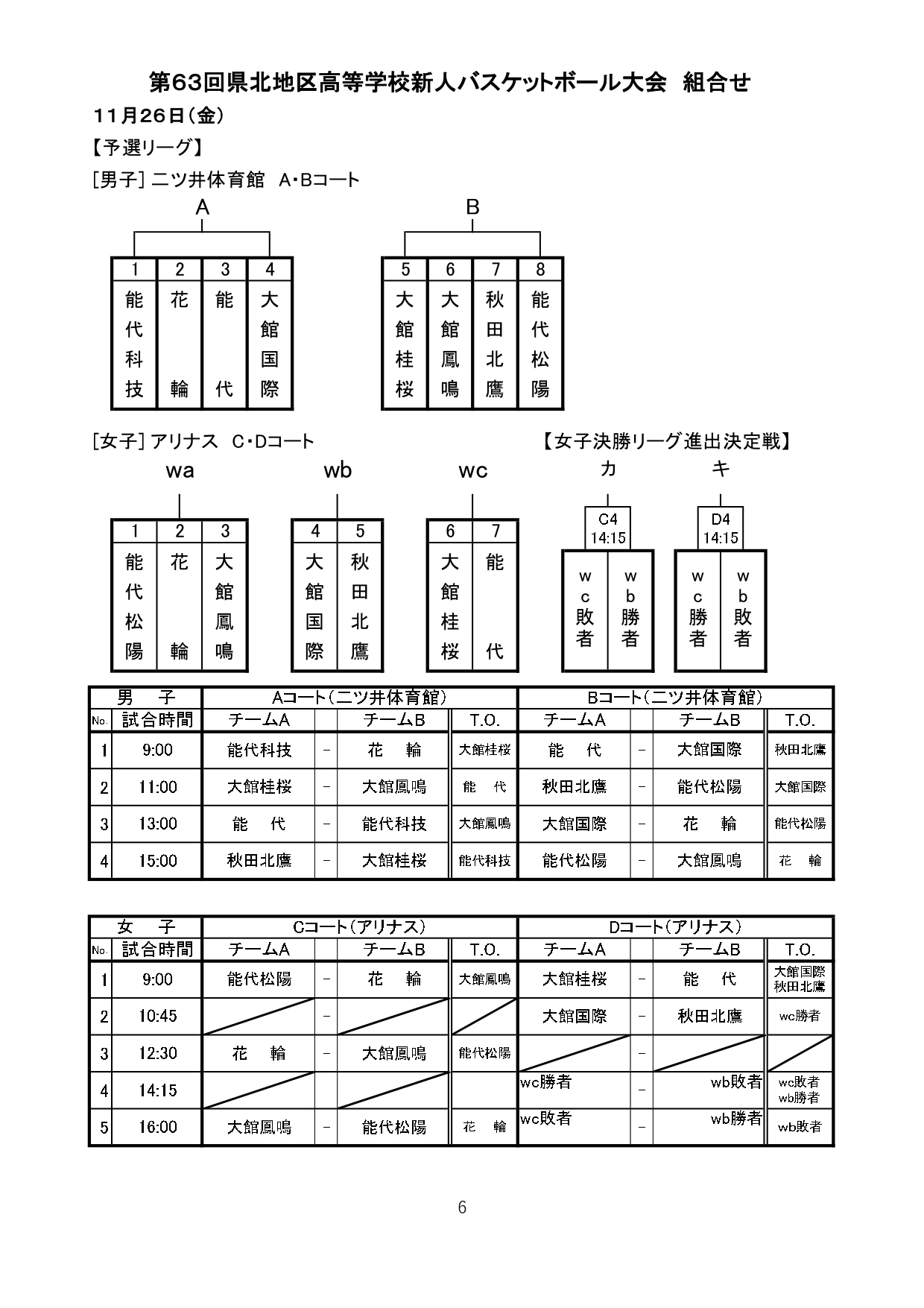 2021/11/24 / 最終更新日時 : 2021/11/24 hoophall お知らせ 第63回県北地区高校新人バスケットボール大会開催のお知らせ(11/24) 第63回県北地区高校新人バスケットボール大会が11月26日(金)から28日(日)までの3日間、能代市の二井体育館とアリナスで開催されます。 大会には男子8校、女子7校が出場し、能代市からは、男子が能代科学技術、能代、能代松陽、女子が能代、能代松陽が出場します。各校のみなさん、頑張ってください‼ なお、保護者のみの入場となっております。一般の方はご入場できませんので、ご理解ください。 組み合わせは以下のとおりです。 〈11月26日〉 〈11月27・28日〉 Follow me! FacebookXHatenaPocketCopy