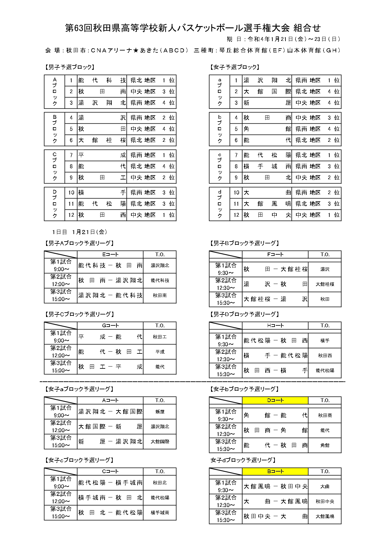 第63回秋田県高等学校新人バスケットボール選手権大会が1/21(金)~1/23(日)まで、秋田市のCNAアリーナ★あきたなどで開催されます。