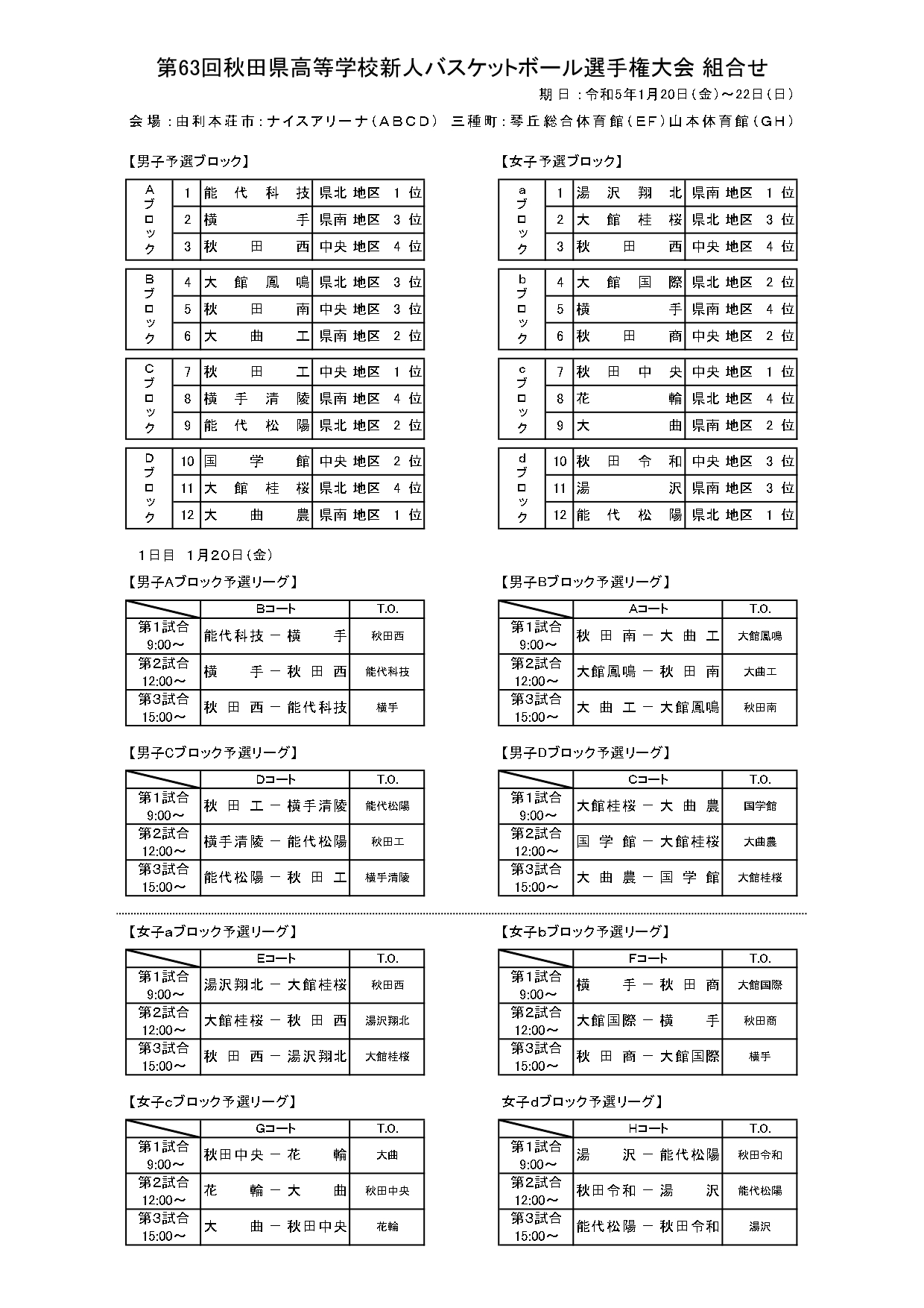 2023/01/10 / 最終更新日時 : 2023/01/23 hoophall お知らせ 第64回秋田県高校男女新人バスケ組み合わせ(1/10) 第64回秋田県高校男女新人バスケットボール選手権大会が1/20日~22日まで、由利本荘市のナイスアリーナなどで開催されます。 能代市からは、男子が能代科技(県北地区1位)、能代松陽(同2位)、女子が能代松陽(県北地区1位)の3校が出場します。 なお、一般観客の観戦はできませんのでご了承ください。 組み合わせは以下のとおりです。 Follow me! FacebookXHatenaPocketCopy
