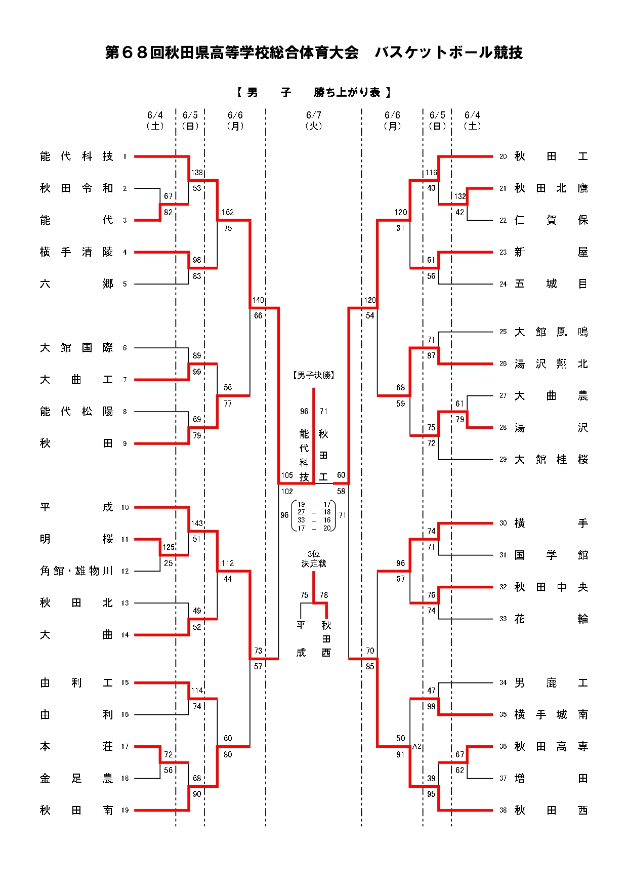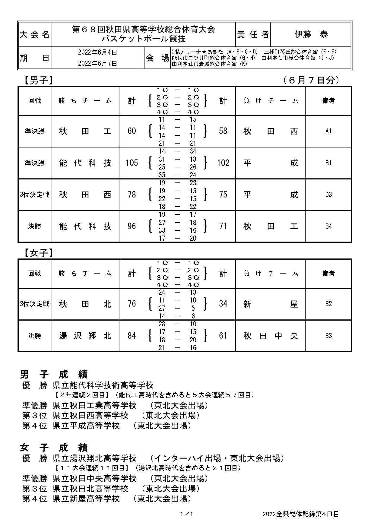 第68回秋田県高総体が6/4~6/7まで、秋田市のCNAアリーナ★あきたなどで開催され、男子は能代科技、女子は湯沢翔北が優勝しました。