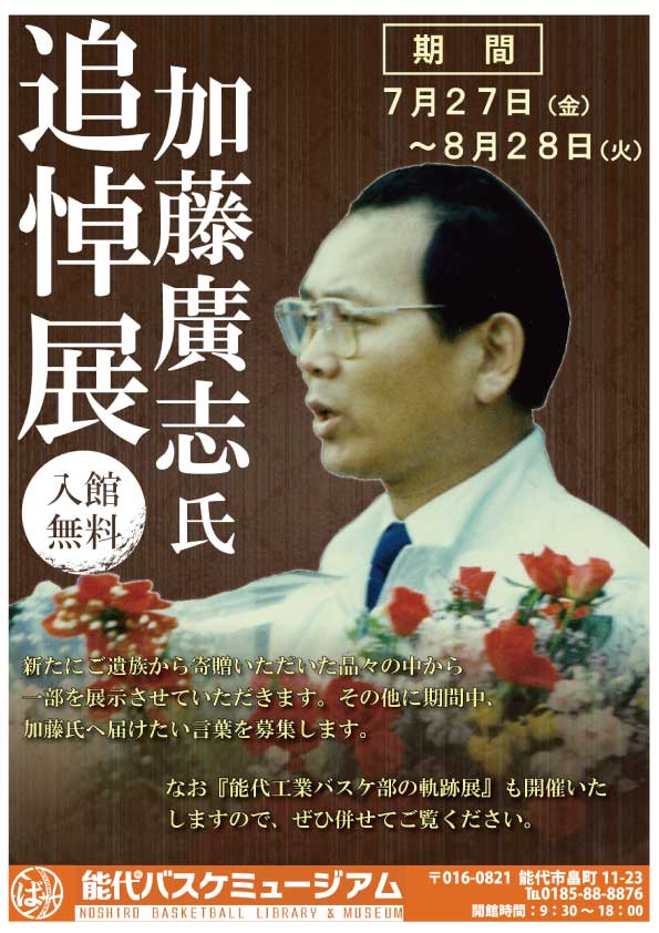 能代工業バスケ部の軌跡展及び加藤廣志氏追悼展開催のお知らせ(7/27~8/28)