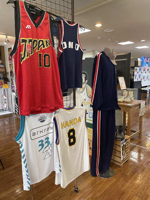 ユニフォームやジャージ、バッシュなど、選手ご本人やファンの方などからご寄贈いただいた品を展示しています。
