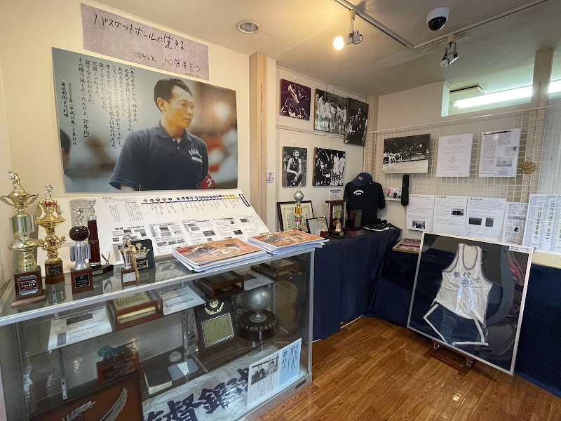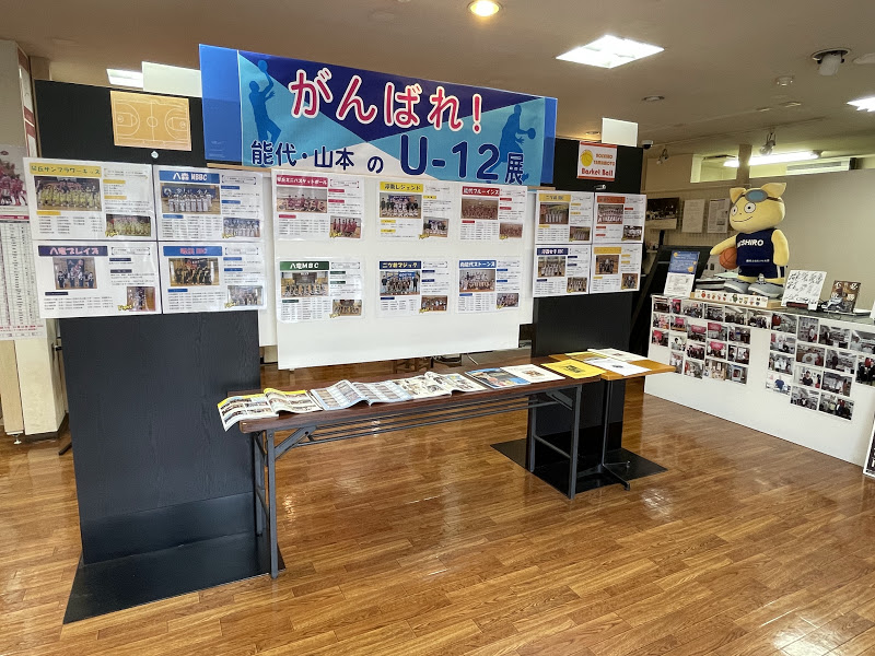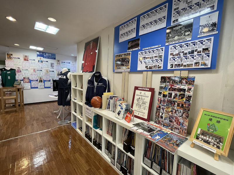 高校バスケの名門、能代工業(現能代科学技術)高校のコーナーです。ユニフォームやトロフィーなどを展示しているほか、過去の試合映像も放映しています。日本人初のNBA選手となったOBの田臥勇太選手の展示も充実!現役部員の紹介コーナーもあります。