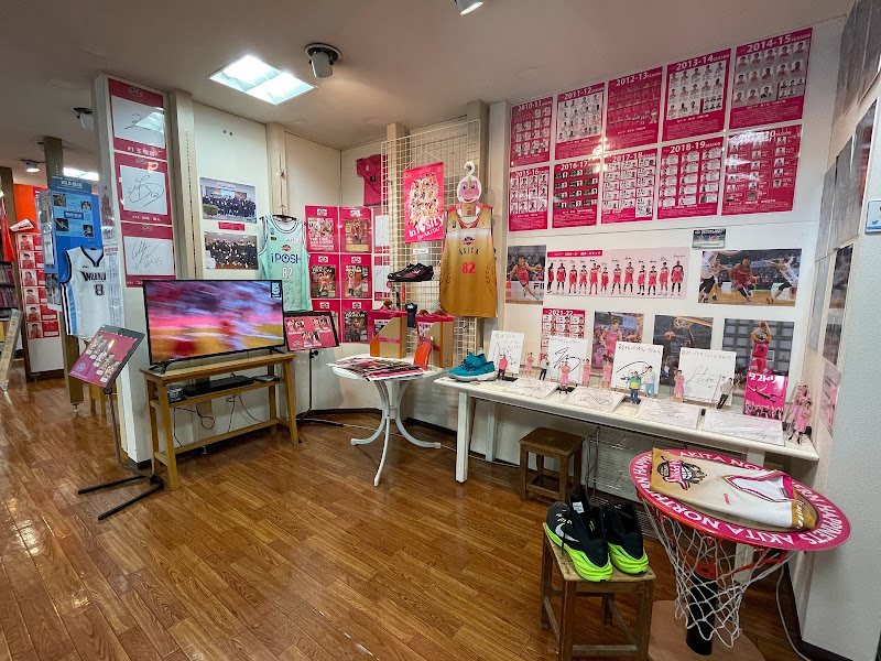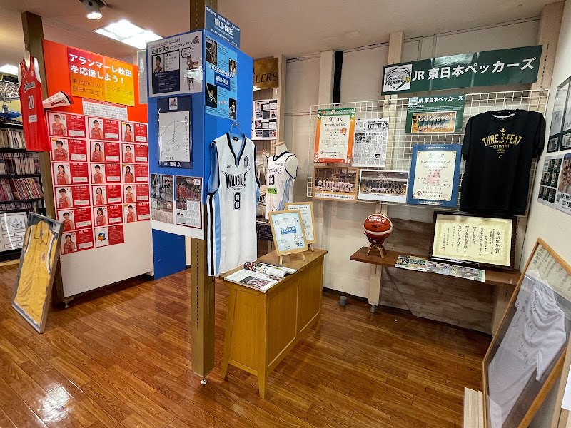 秋田市をホームタウンとするB1の秋田ノーザンハピネッツのコーナーです。選手のサインやユニフォームなどのグッズのほか、歴代選手のパネルも展示しています。「おらほのチーム」を全力応援!