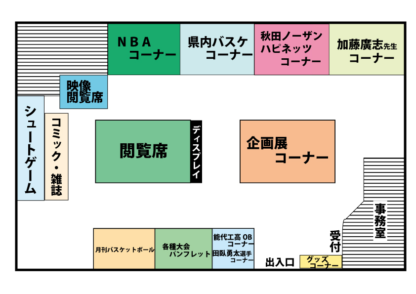 このページでは、能代バスケミュージアムの館内マップを掲載しています。見学順路は特にありませんので、お好きな順番でご見学ください。